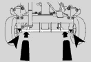 ● それぞれの方向の台車下部誘導ラベル(▼)部分を目安にフォークリフトのツメを合わせ、丸パイプ下に奥まで差し込みすくい上げます